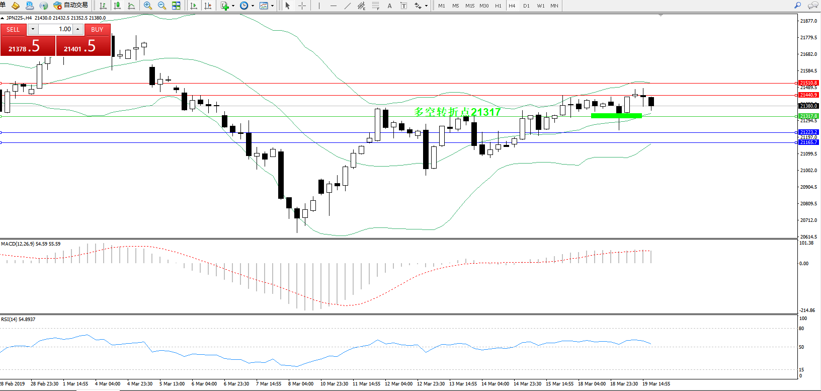 技术点评:行情延续布林带中上轨区间震荡上行中,上行走势较为缓慢,MACD指标0轴上方整理中,RSI指标有回归50均衡线的迹象;