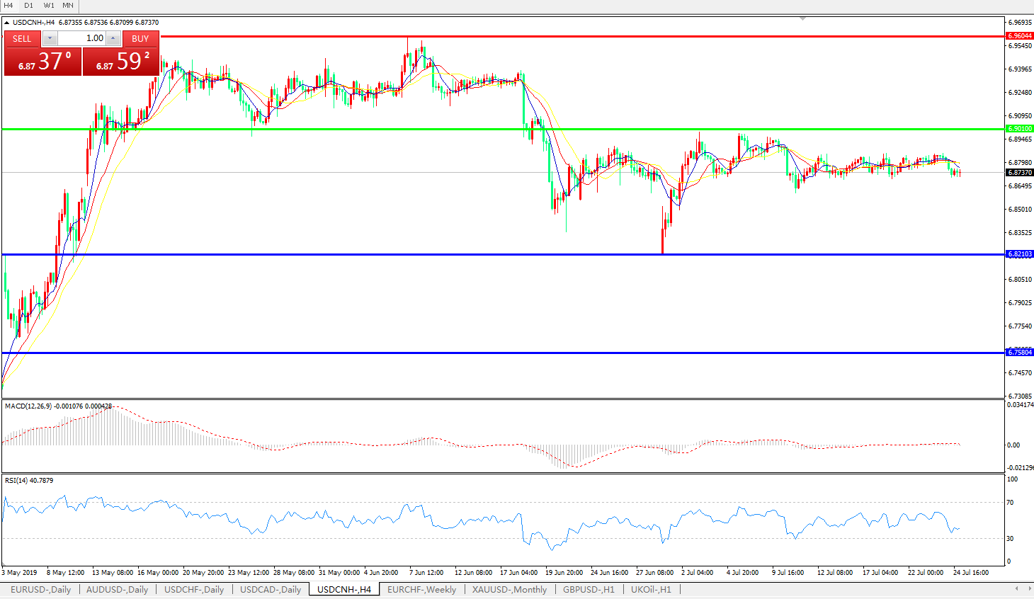 技术面简析:日图均线有发散下行迹象,MACD徘徊在0轴附近且动能柱若隐若现,RSI快速走低,行情连续整理后有下行迹象,预计短期汇价将继续整理或向下修正,中期关注6.9010附近多空转折区域压制是否有效及中美贸易谈判最新进展。