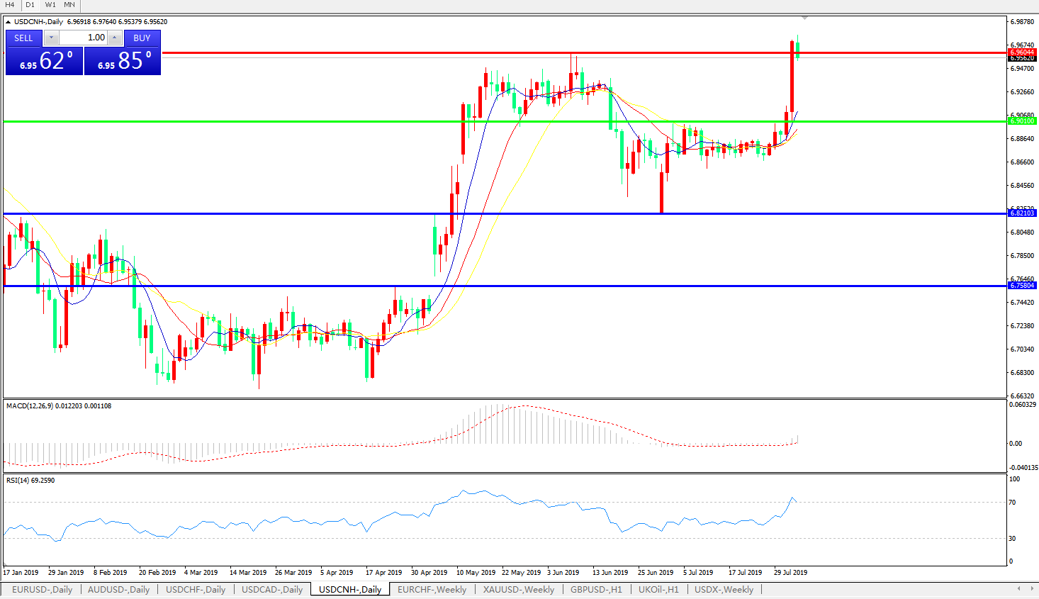 技术面简析:日图均线呈发散上行态势,汇价昨日大阳线崛起突破6.96关口压制,MACD开始运行在0轴上方且动能有放量迹象,RSI快速上攻,,预计汇价将进一步上行,试探6.98-7.0区间压制。