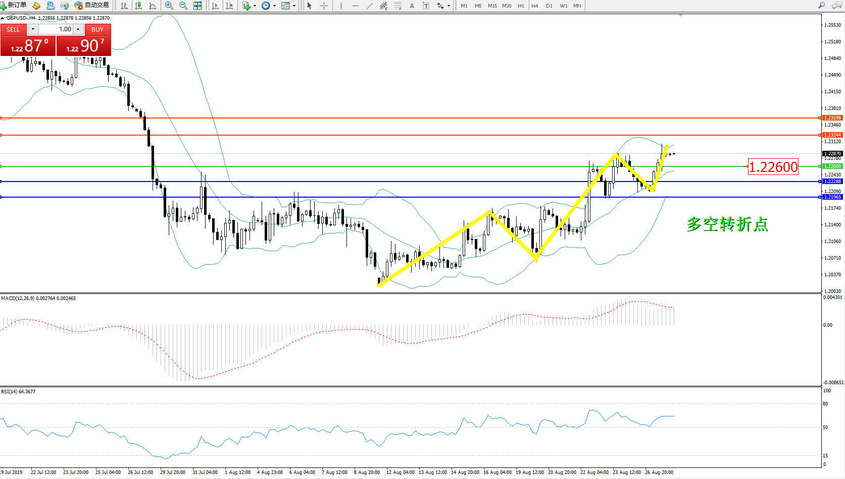 交易策略:1.22600上方看涨,目标1.23244、1.23598