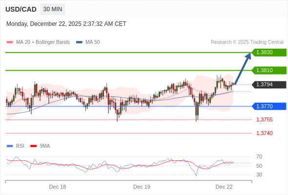 在 1.3770 之上,看涨,目标价位为 1.3810 ,然后为 1.3830 。