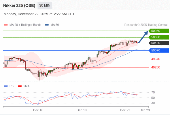 日经225股指期货 (OSE) 当日内: 在50070之上,看涨。