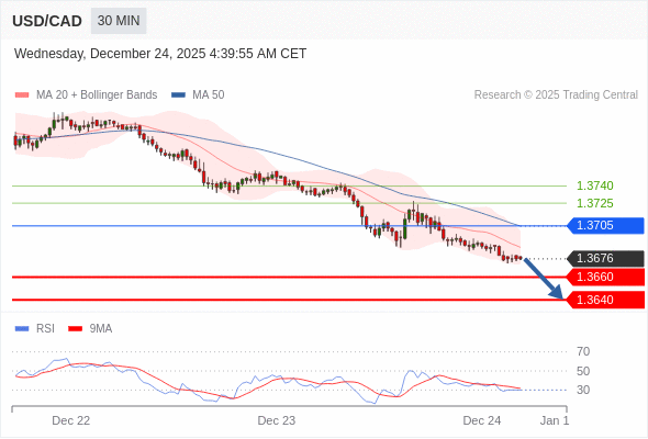 在 1.3705 之下,看跌,目标价位为 1.3660 ,然后为 1.3640 。