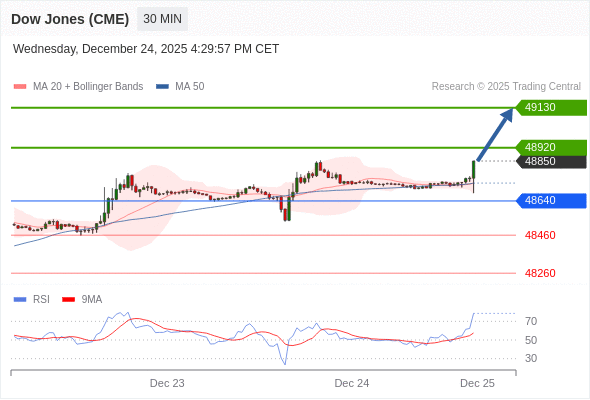 在 48640 之上,看涨,目标价位为 48920 ,然后为 49130 。