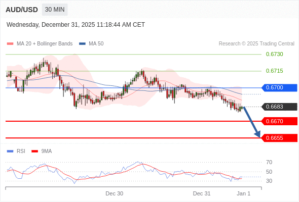 在 0.6700 之下,看跌,目标价位为 0.6670 ,然后为 0.6655 。