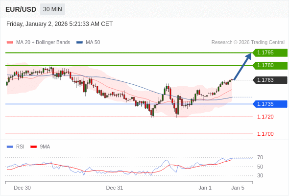 在 1.1735 之上,看涨,目标价位为 1.1780 ,然后为 1.1795 。