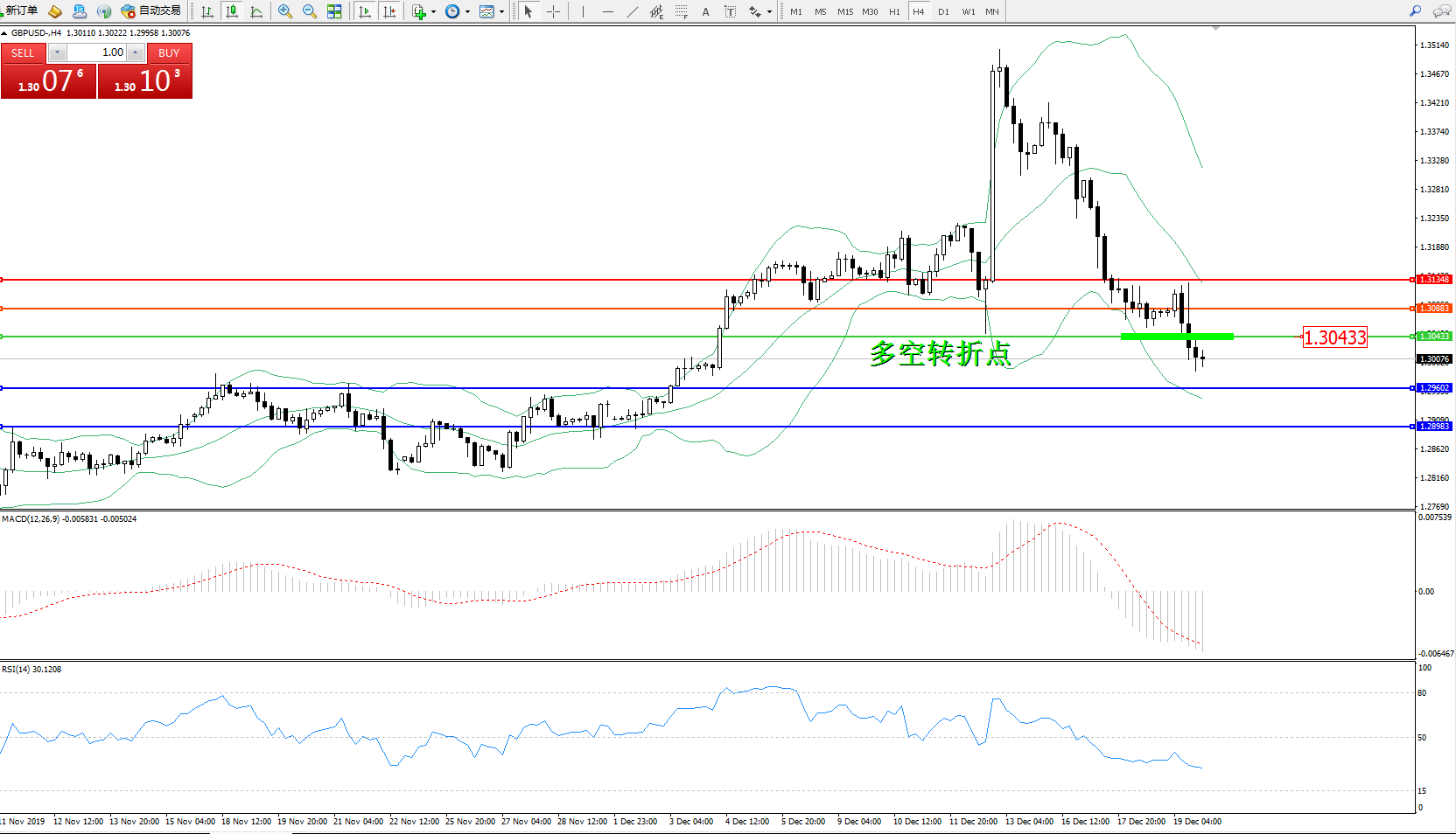 交易策略:1.30433下方看跌,目标1.29602、1.28963