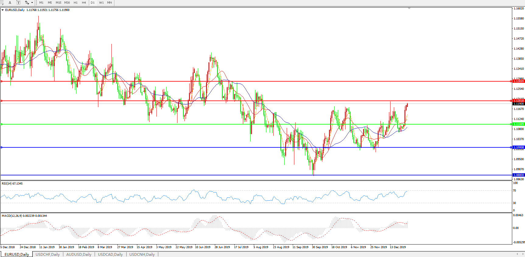 欧元兑美元在周五日内大幅走强,欧洲时段盘中触及一周多新高1.1150,原因在于在圣诞假期过后,市场资金进行的重新配置,此前在节日期间流入美元计价资产避险的资金重新在乐观市场情绪的推动下重新流向高风险货币,导致欧系与商品系货币普涨;此外,欧洲央行日内发布新报告,对2020年经济前景给出积极预测,认为欧元区经济最低迷的时刻已经过去,这也进一步强化了市场做多欧元的动能。投资者同时还继续看好全球多边贸易环境能够在2020年得到进一步的缓和重整; 这意味着欧元兑美元有望自7月1日以来,时隔近半年日线收盘再度站上200日均线,而这将意味着中期走势有望录得反转,之后汇价将有望进一步上攻至1.1175一线。