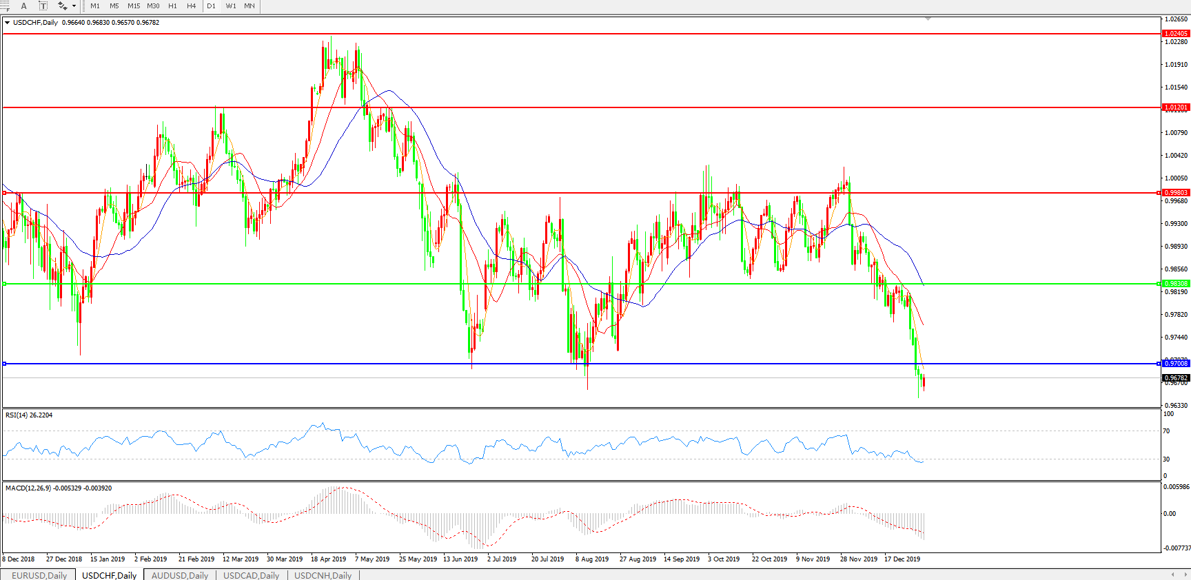 技术面简析:日线图均线呈有序空头排列,汇价快速跌破0.97关口并继续下行,MACD持续下行且量能加速放量,RSI进入超卖区域后小幅走高,预计汇价大概率将进一步下行。