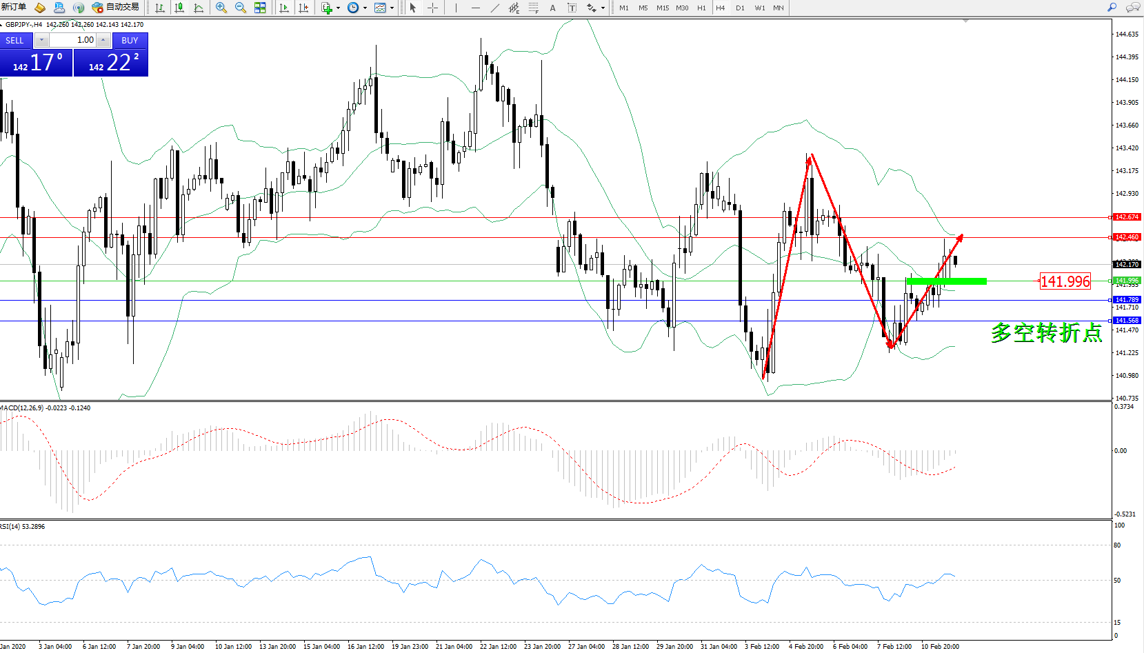 交易策略:141.996上方看涨,目标142.460、142.674