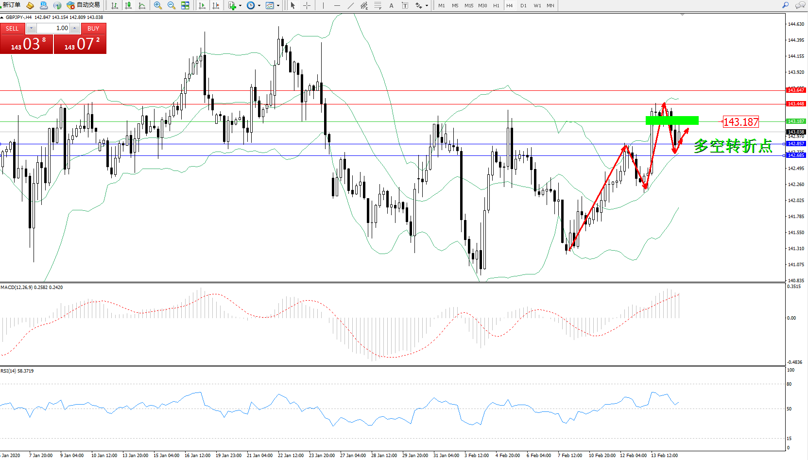 交易策略:143.187下方看跌,目标142.857、142.685