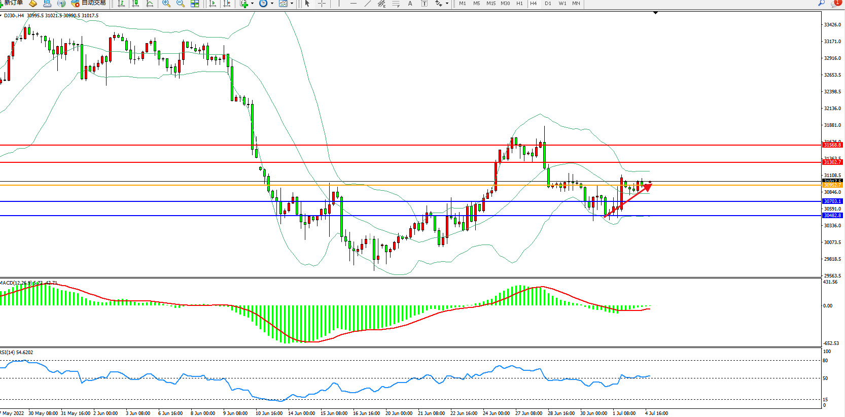 道琼斯指数DJ30——4小时K线图显示: