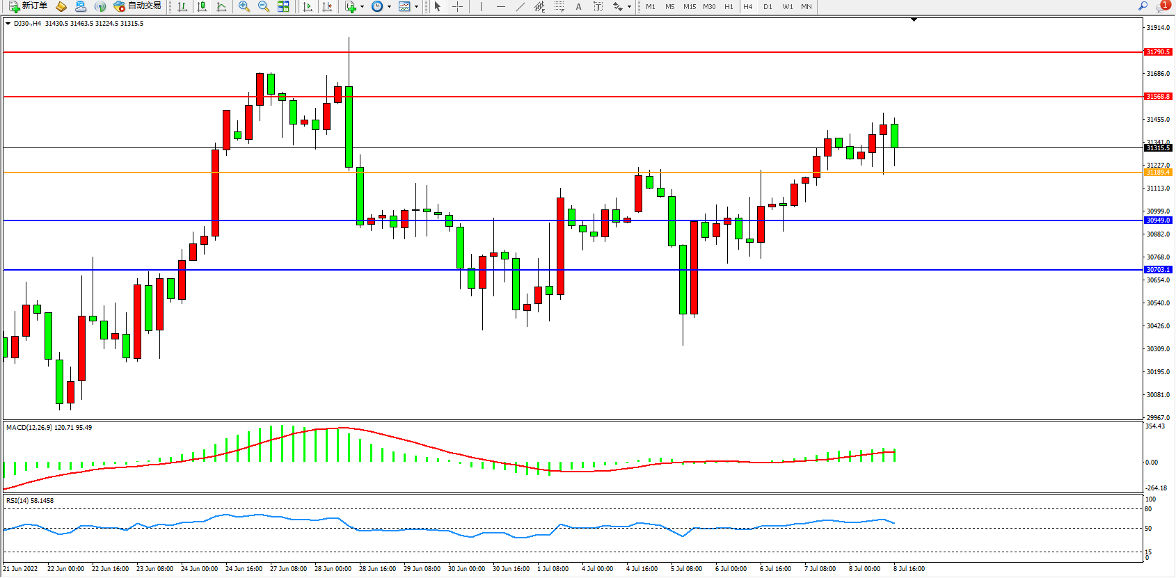 道琼斯指数DJ30——4小时K线图显示: