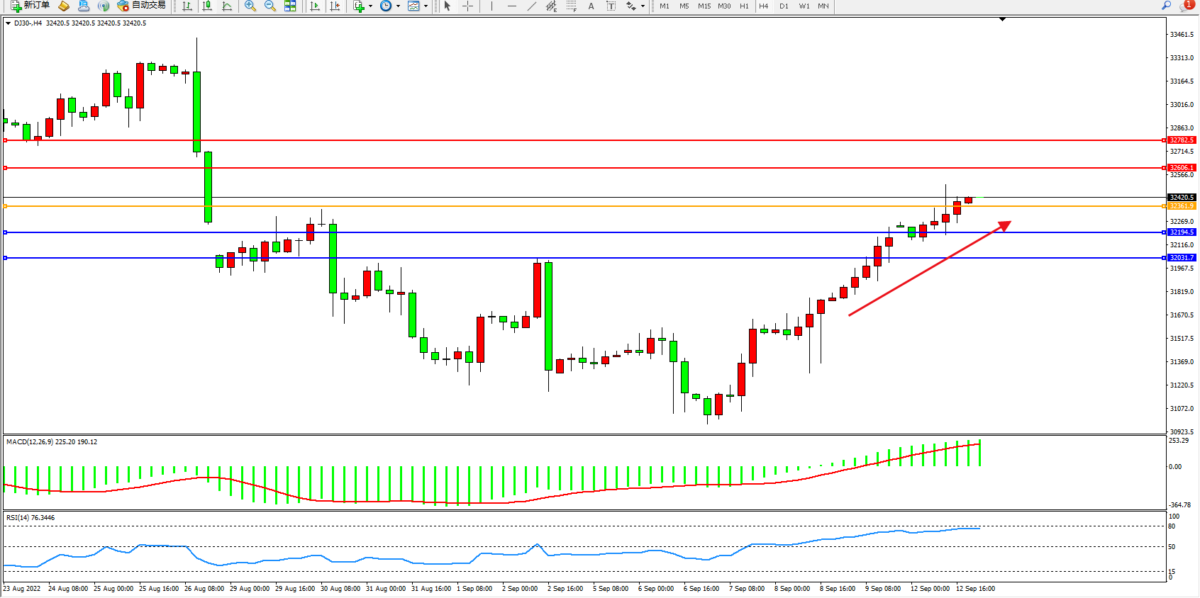 道琼斯指数DJ30——4小时K线图显示:
