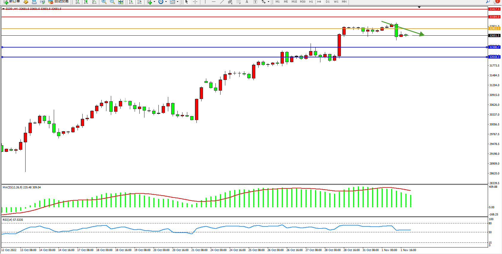 道琼斯指数DJ30——4小时K线图显示: