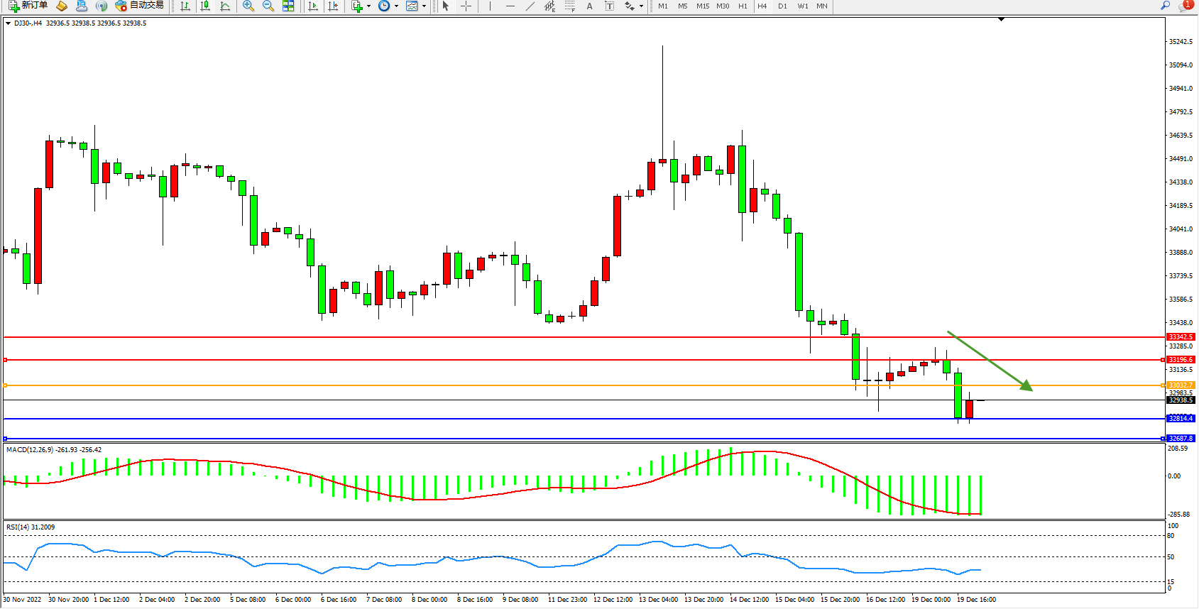 道琼斯指数DJ30——4小时K线图显示: