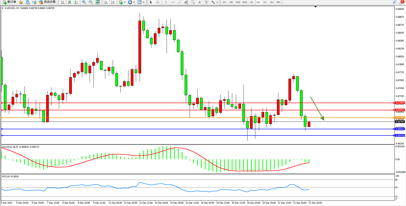 澳元美元AUDUSD——4小时K线图显示: