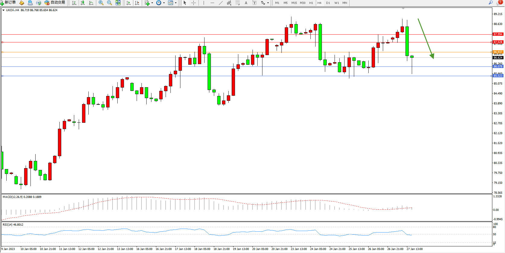 交易策略:86.937下方看跌,目标86.078、85.523