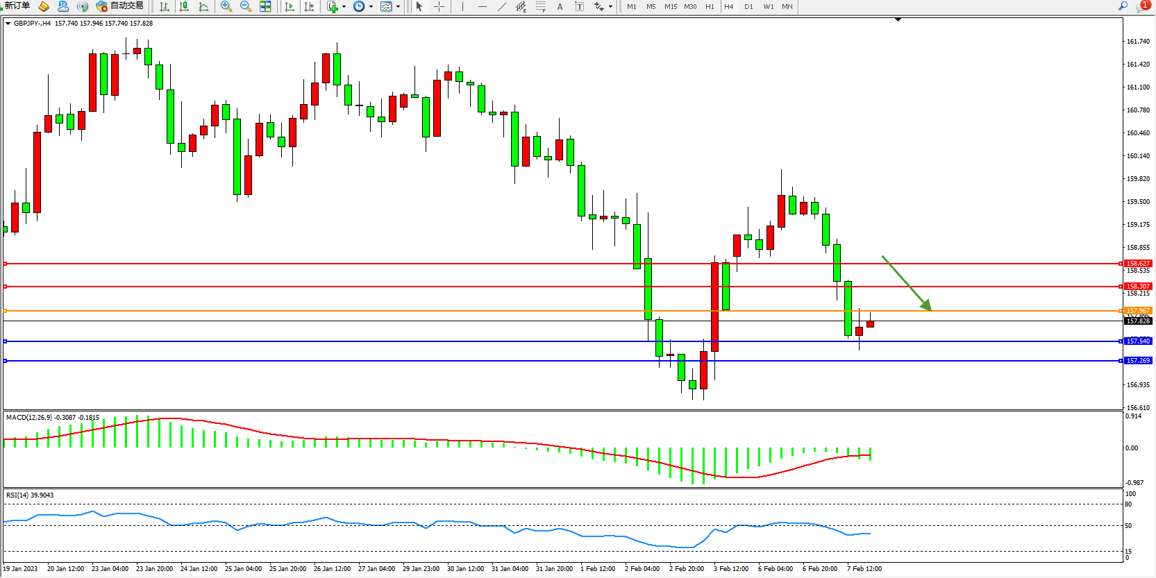 交易策略:157.967下方看跌,目标157.540、157.269