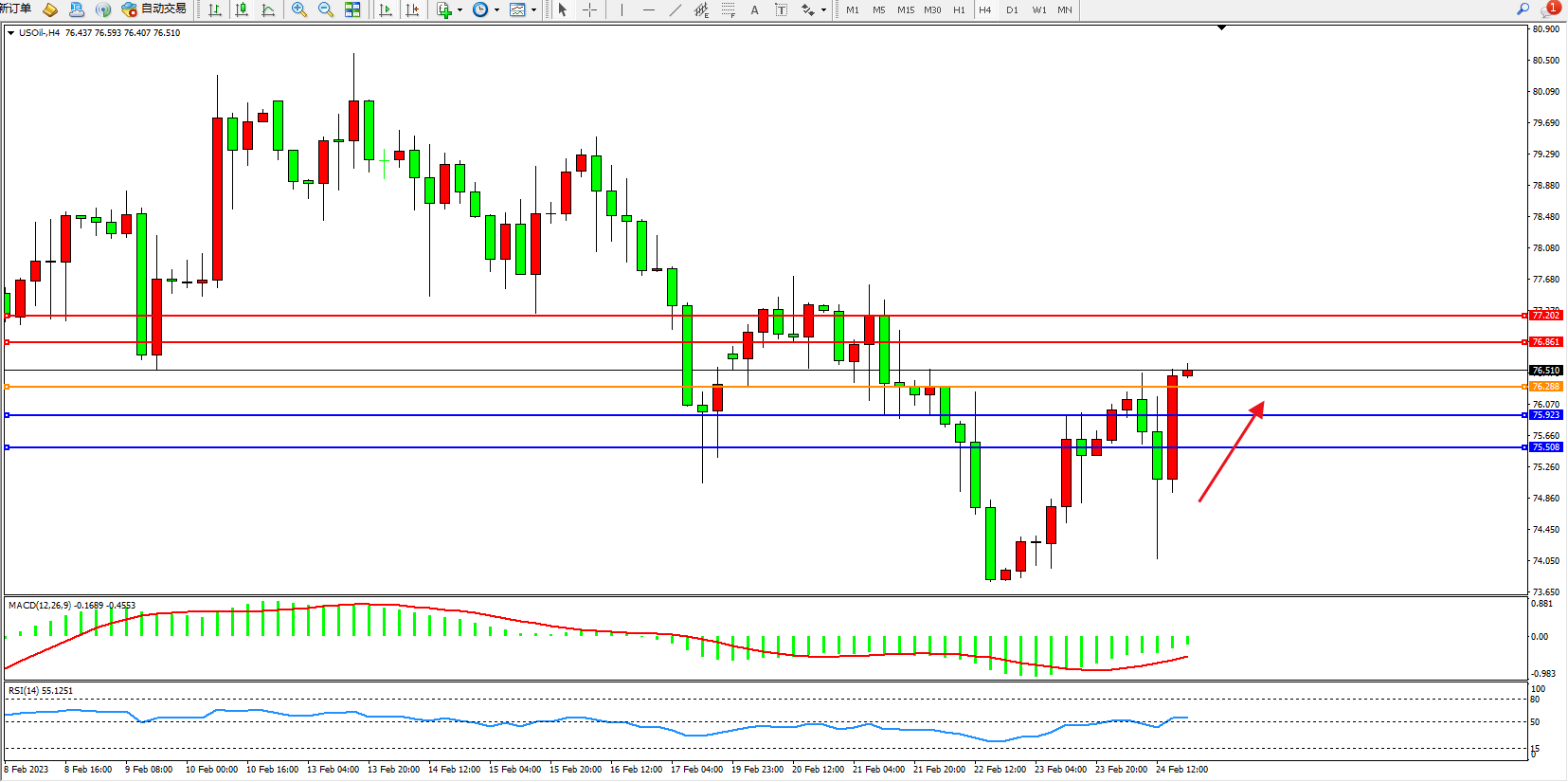 交易策略:76.288上方看涨,目标76.861、77.202