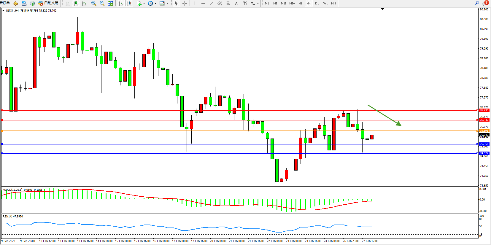 交易策略:75.898下方看跌,目标75.350、74.972