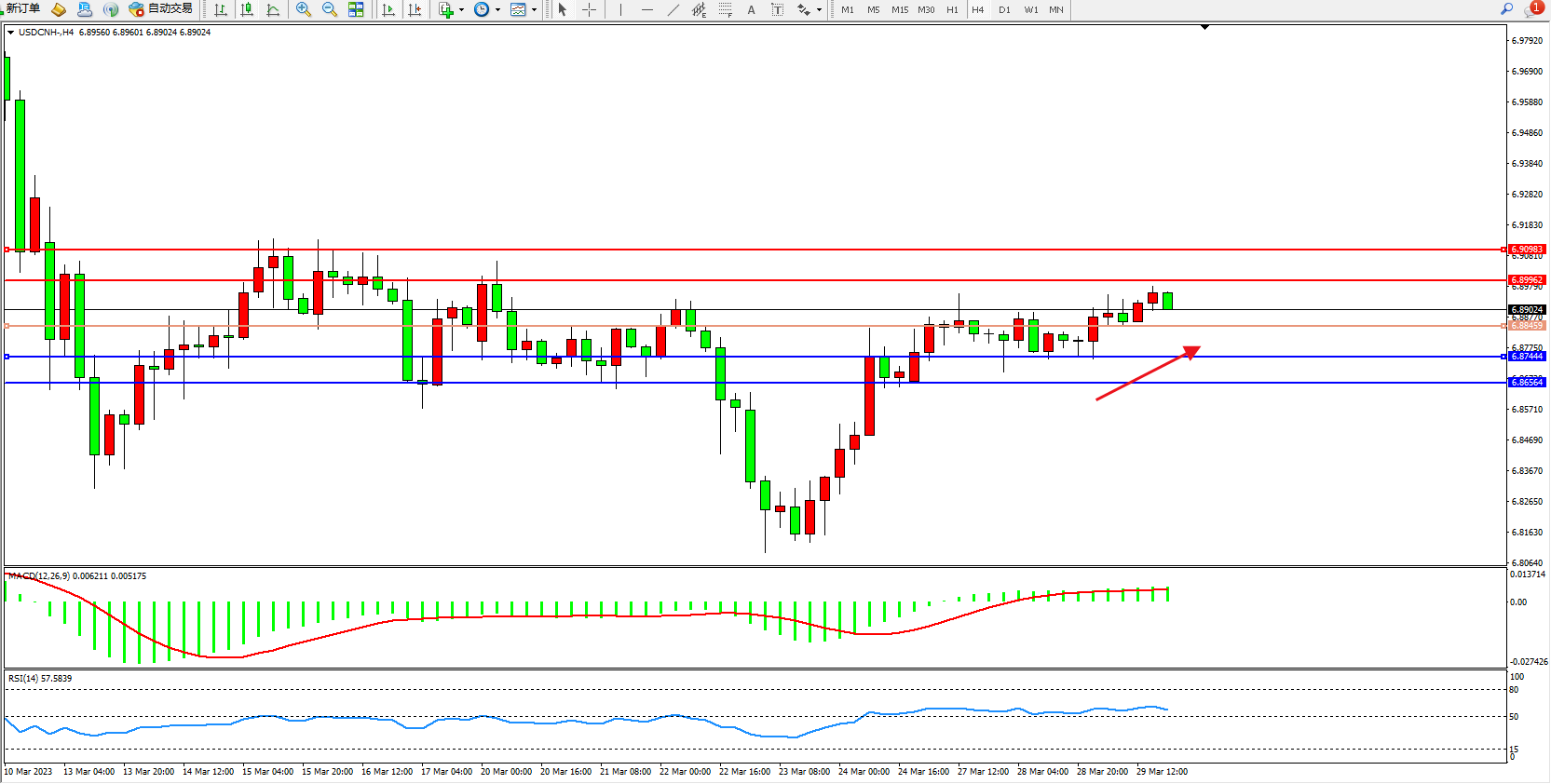 交易策略:6.88459上方看涨,目标6.89962 6.90983