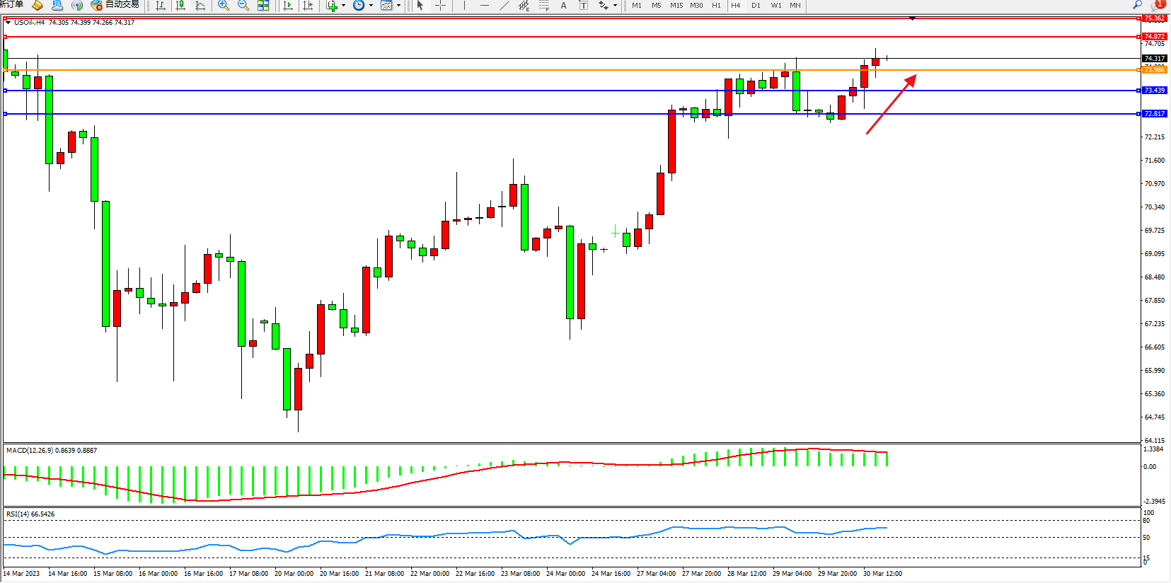 交易策略:74.317上方看涨,目标74.872 75.362