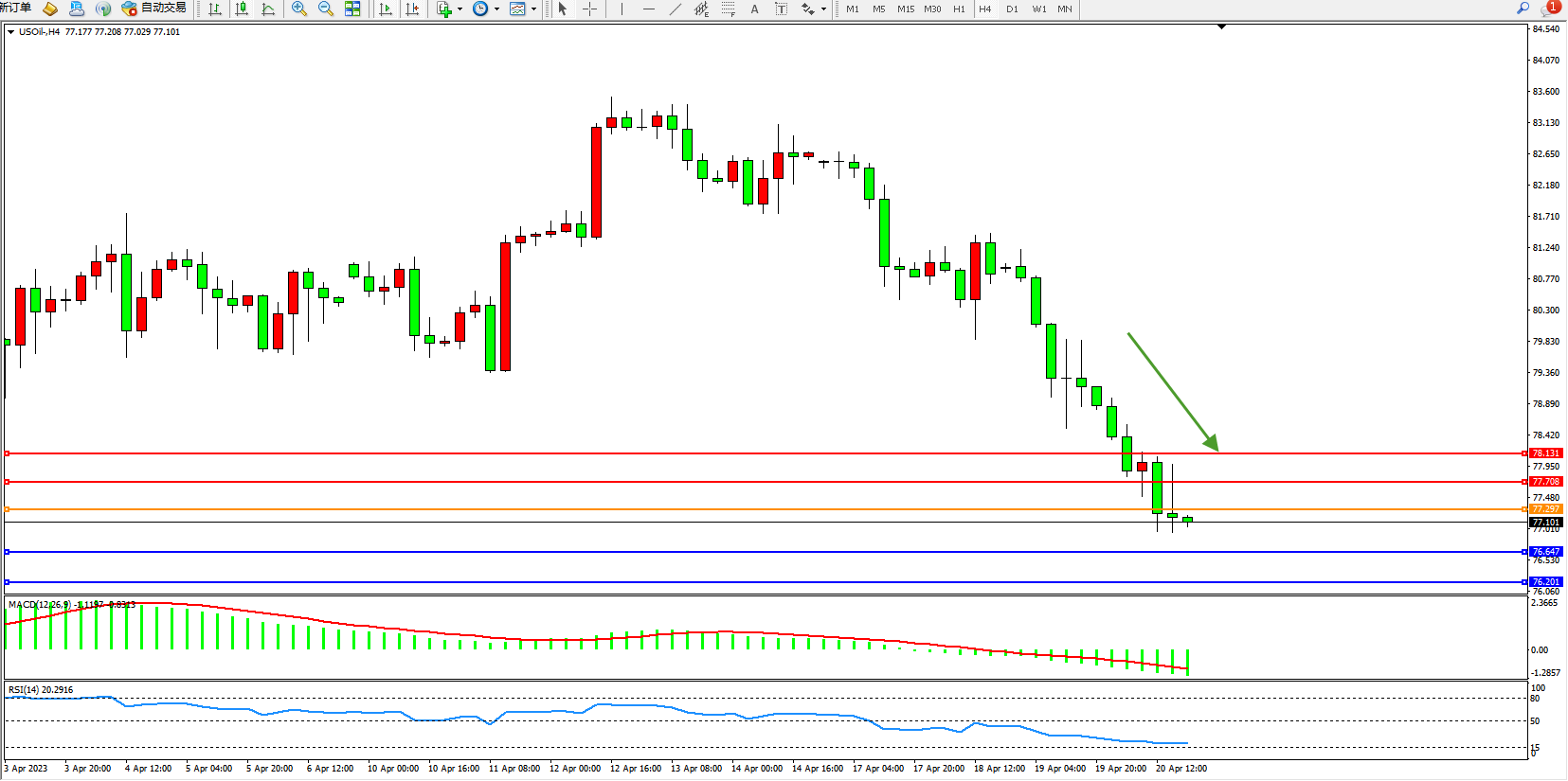 交易策略:77.297下方看跌,目标76.647  76.201