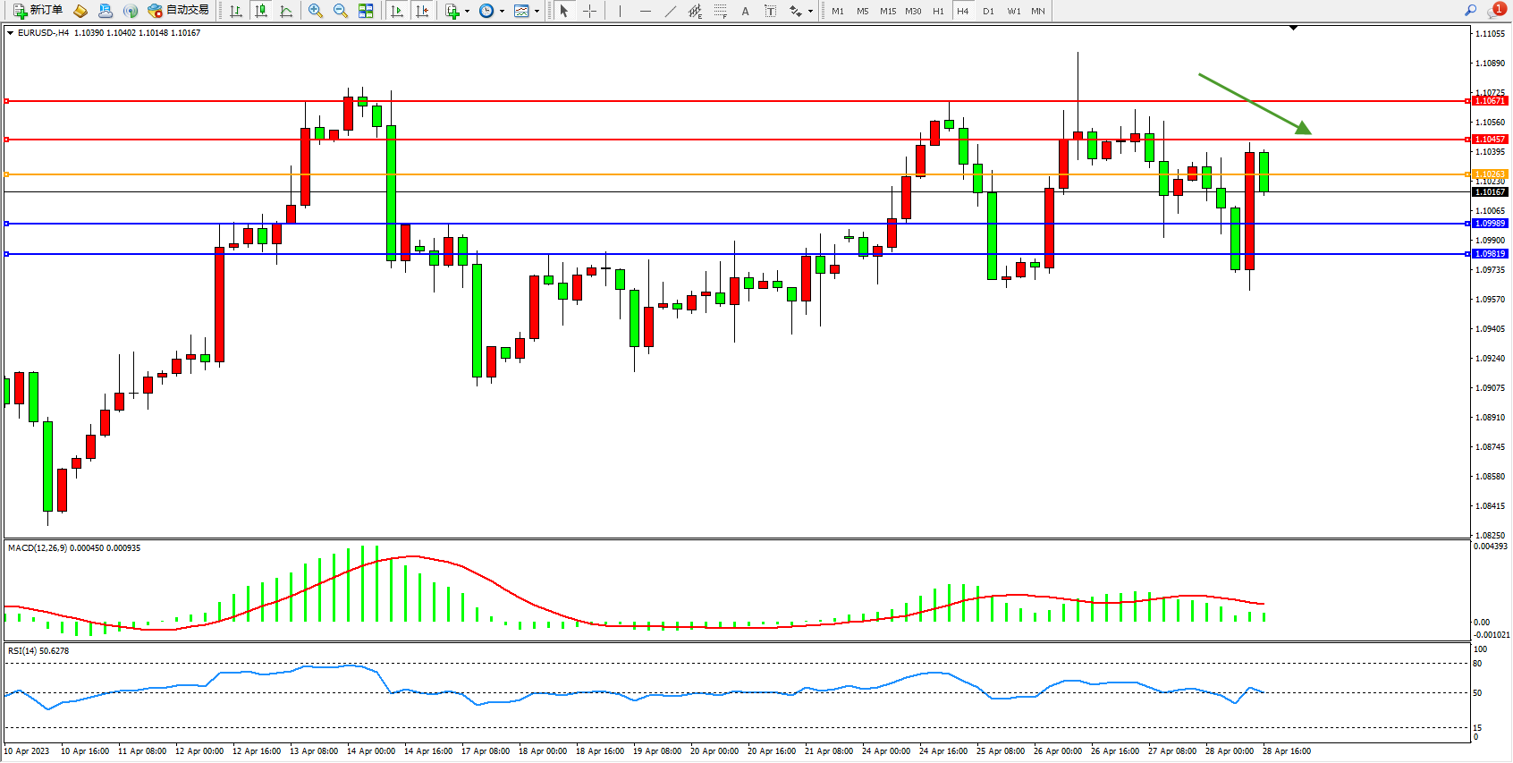 备选策略:1.10263上方看涨,目标1.10457  1.10671