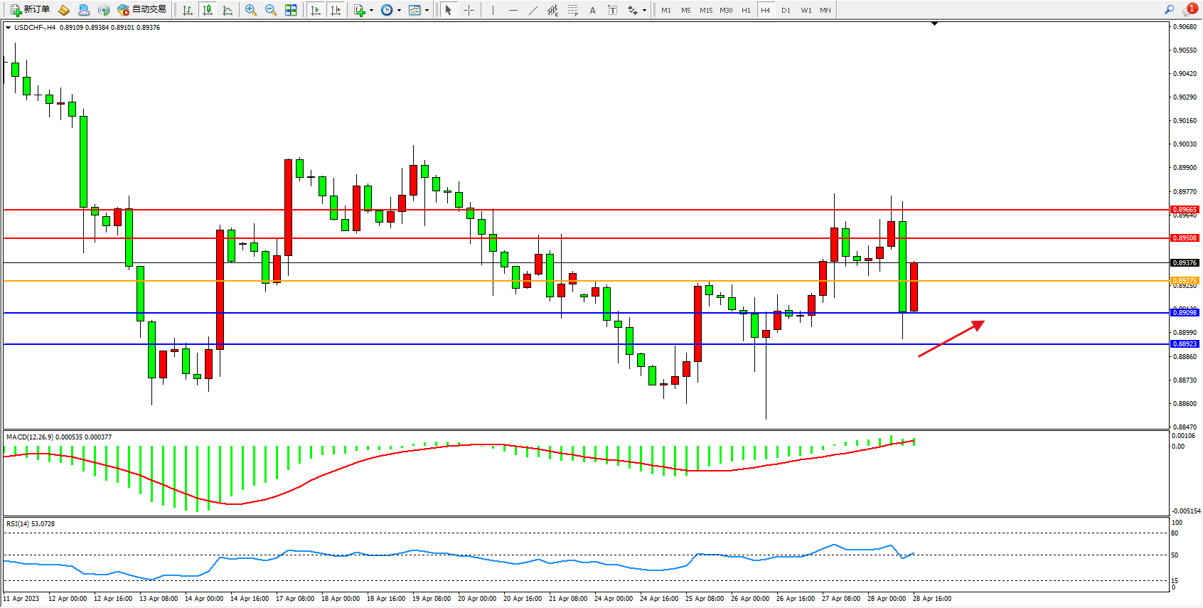 美元瑞郎USDCHF——4小时K线图显示: