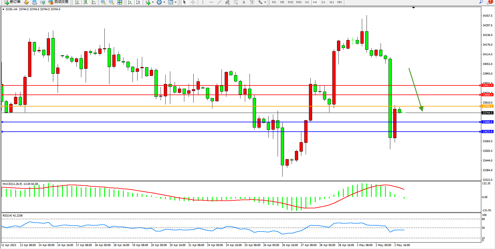 道琼斯指数DJ30——4小时K线图显示: