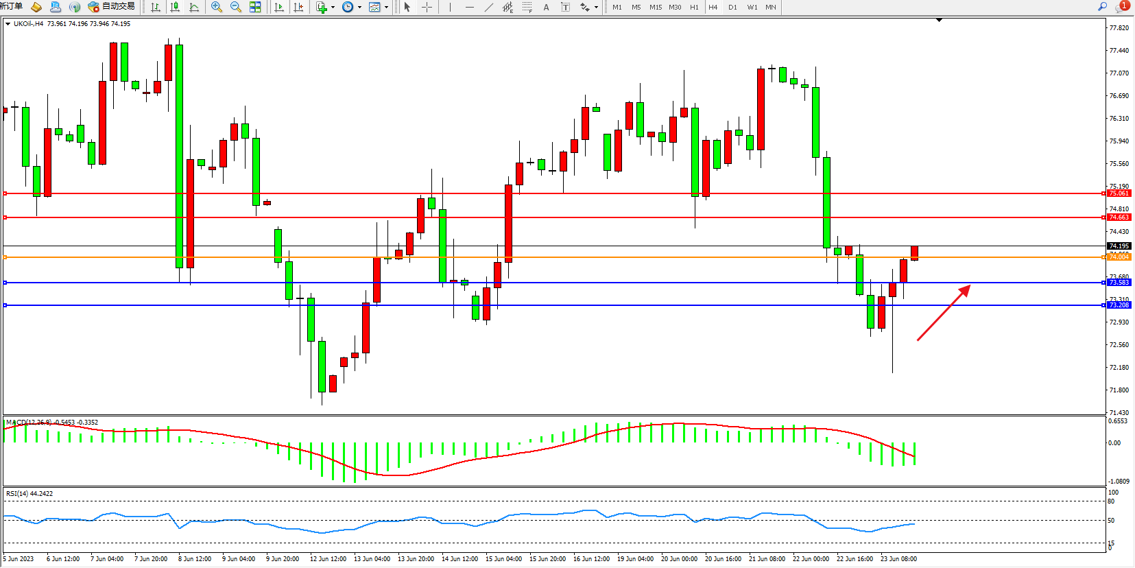 4小时图看:低位多头动力持续反转上扬,短期多头有继续向上移动迹象,MACD指标处于空头区域整理,RSI指标处于50均衡线下侧弱势徘徊;