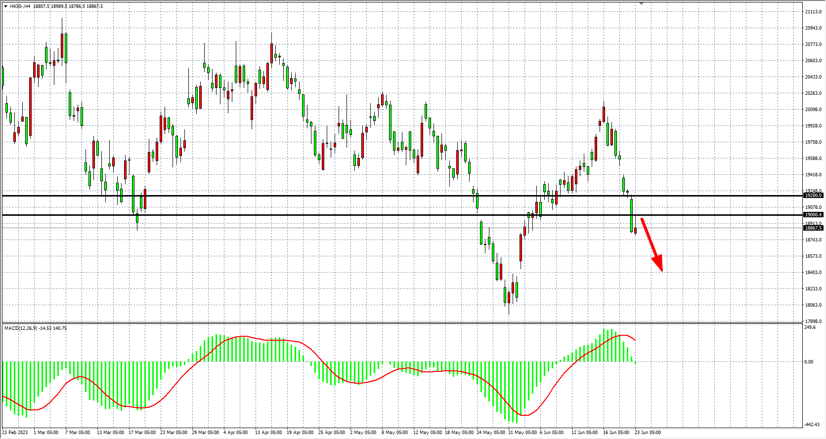 周五(6月23日)恒生指数连续第四个交易日低开,大市成交额报697.98亿港元,收于19000关口下方,周累计下跌5.74%。美联储主席鲍威尔重申须加息应对通胀,触发美元指数反弹,加上英伦银行加息幅度较预期高,全球经济前景看淡。