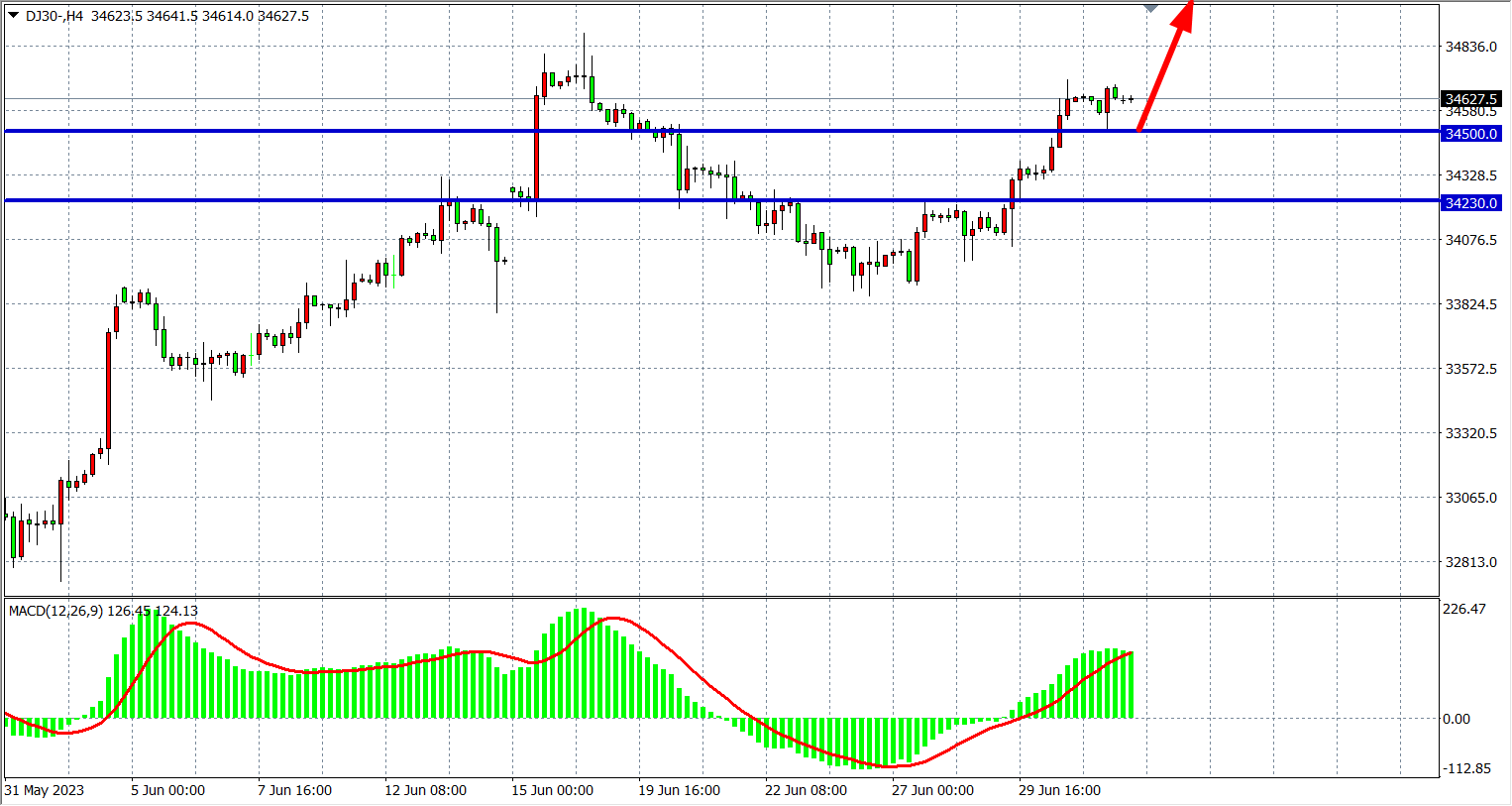 4小时图看,道指在34500之上延续涨势,MACD量能在零轴上维持放量,下方支撑34500-34200,上方阻力34900-35200。