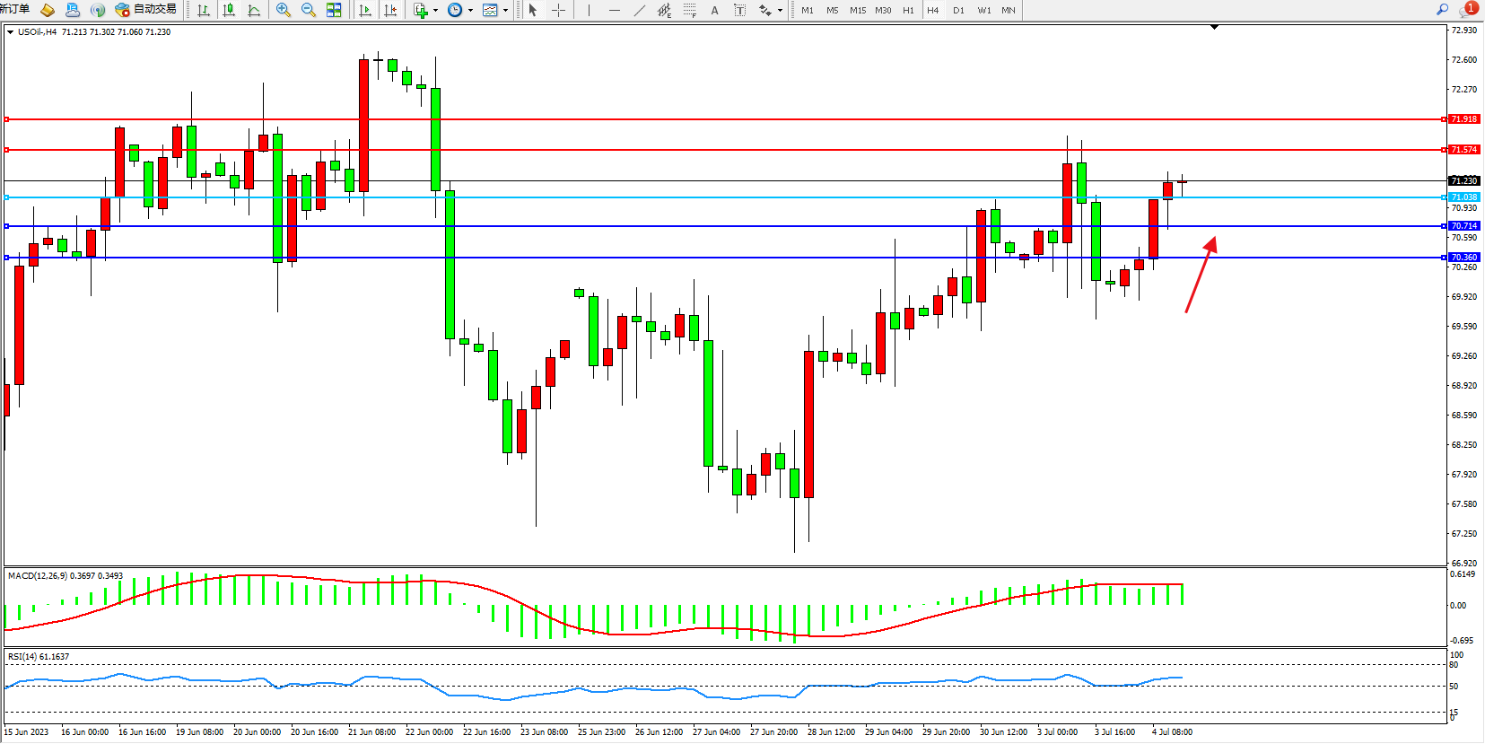 交易策略:71.038上方看涨,目标71.574 71.918