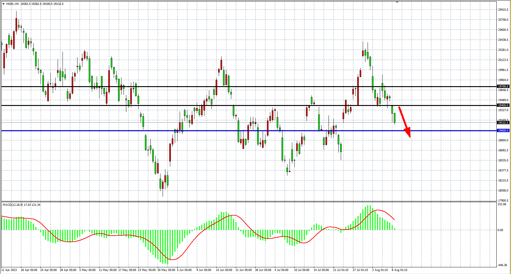 4小时图看,恒指进一步回落扩大跌幅,MACD量能即将下穿零轴,阻力关注19400,该位之下看19000-18600附近。