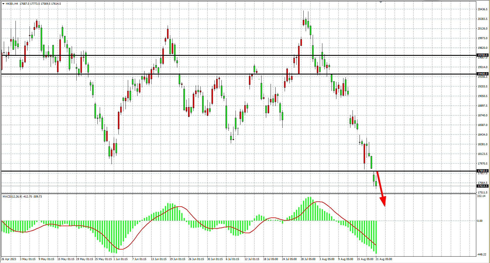 4小时图看,恒指进一步跌破17900,MACD量能继续于零轴下方放量,阻力关注17800-19000。