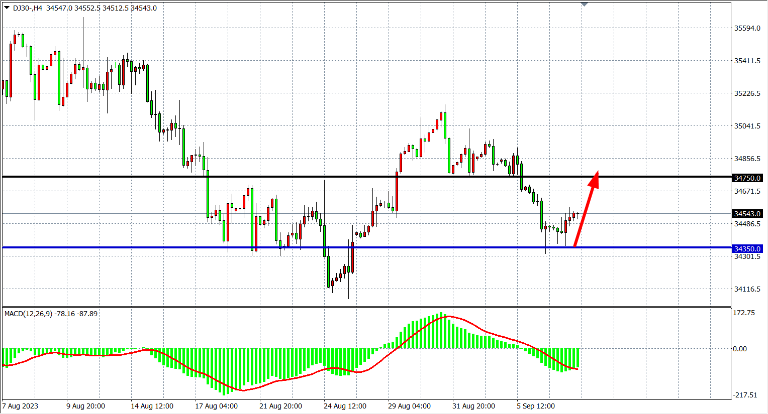 4小时图看,道指在34300附近受支撑反弹,MACD量能在零轴下缩短,支撑关注34350附近,阻力看上方34750-35000附近。