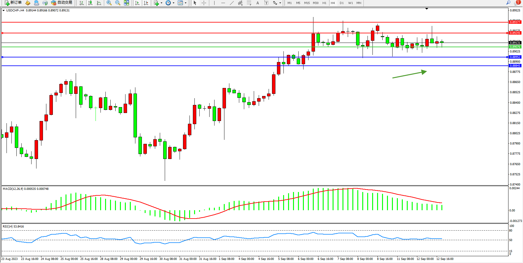 交易策略:0.89076上方看涨,目标0.89245  0.89377
