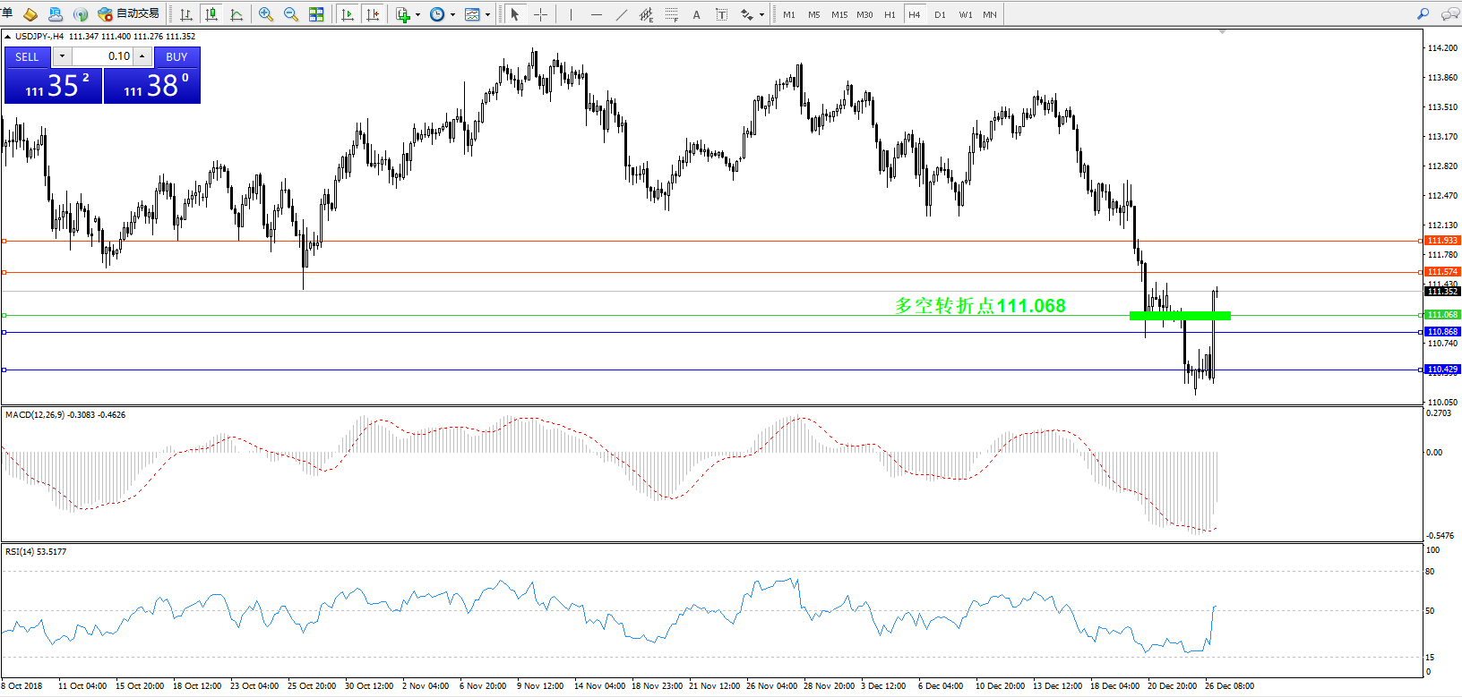 交易策略:111.068上方看涨,目标111.574、111.933