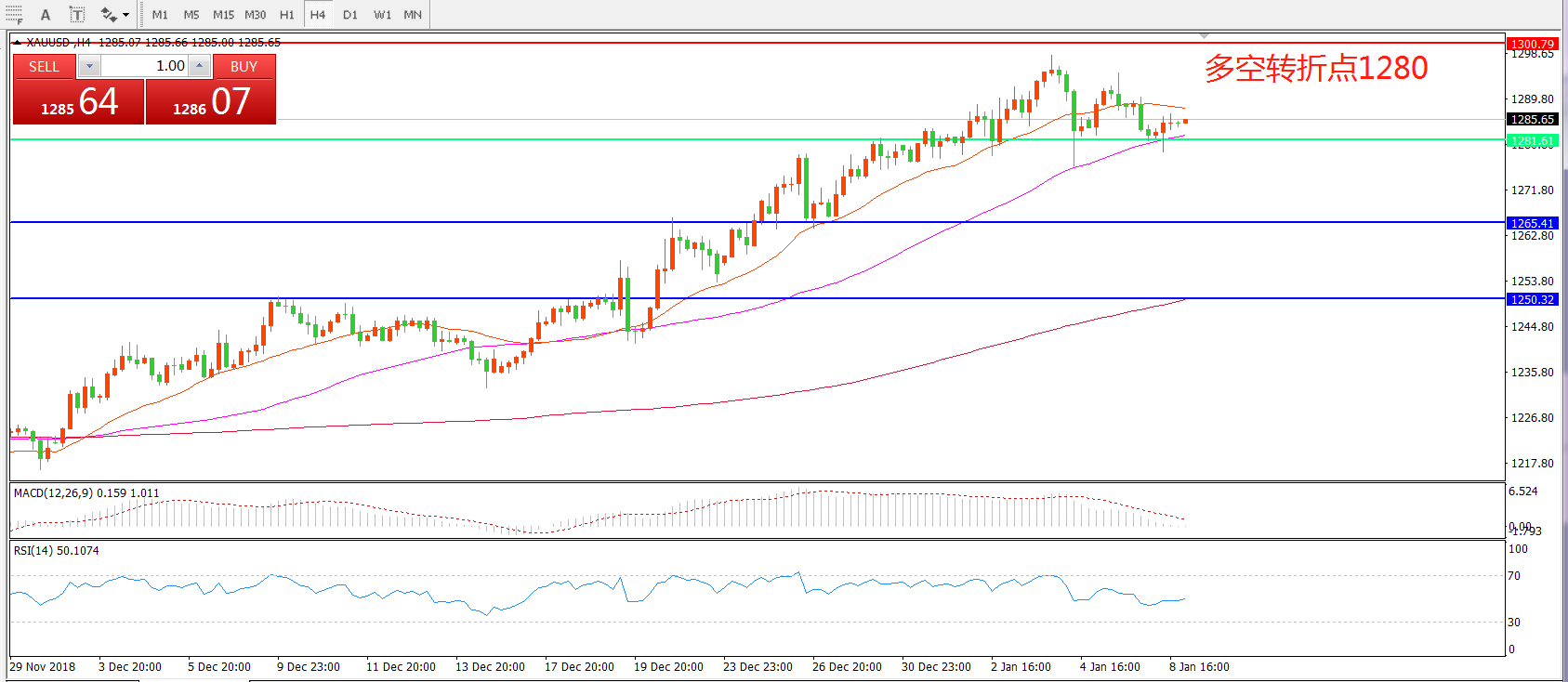 4小时图看,黄金站稳1280后强势上行,1300附近遇阻后陷入整理,短期整理不可避免,但整体依然维持偏多看法。