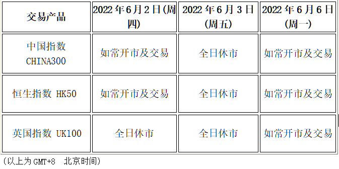因应2022年6月2日(周四)至6月3日(周五)为端午节假期和英国银行假期,本公司以下产品的交易时间将于假期期间作以下安排,敬请留意。