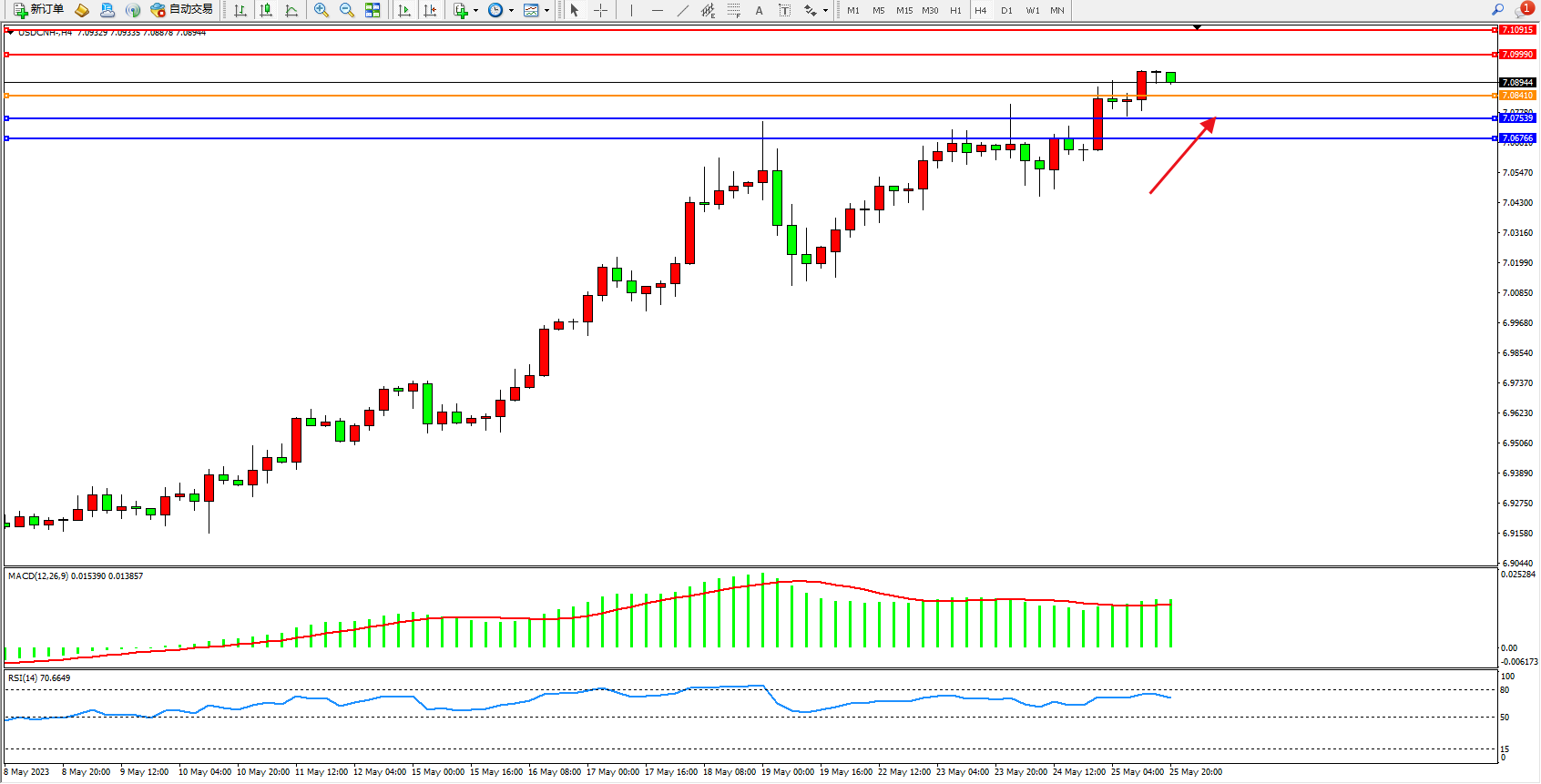交易策略:7.08410上方看涨,目标7.09990 7.10915