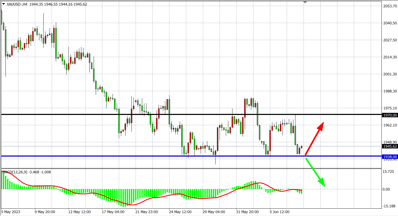 4小时图看,黄金冲高回落于1970受阻,再度跌至1938附近暂时走平,MACD量能在零轴下小幅放量,当前支撑关注1938附近,跌破该位下看1920-1900附近。