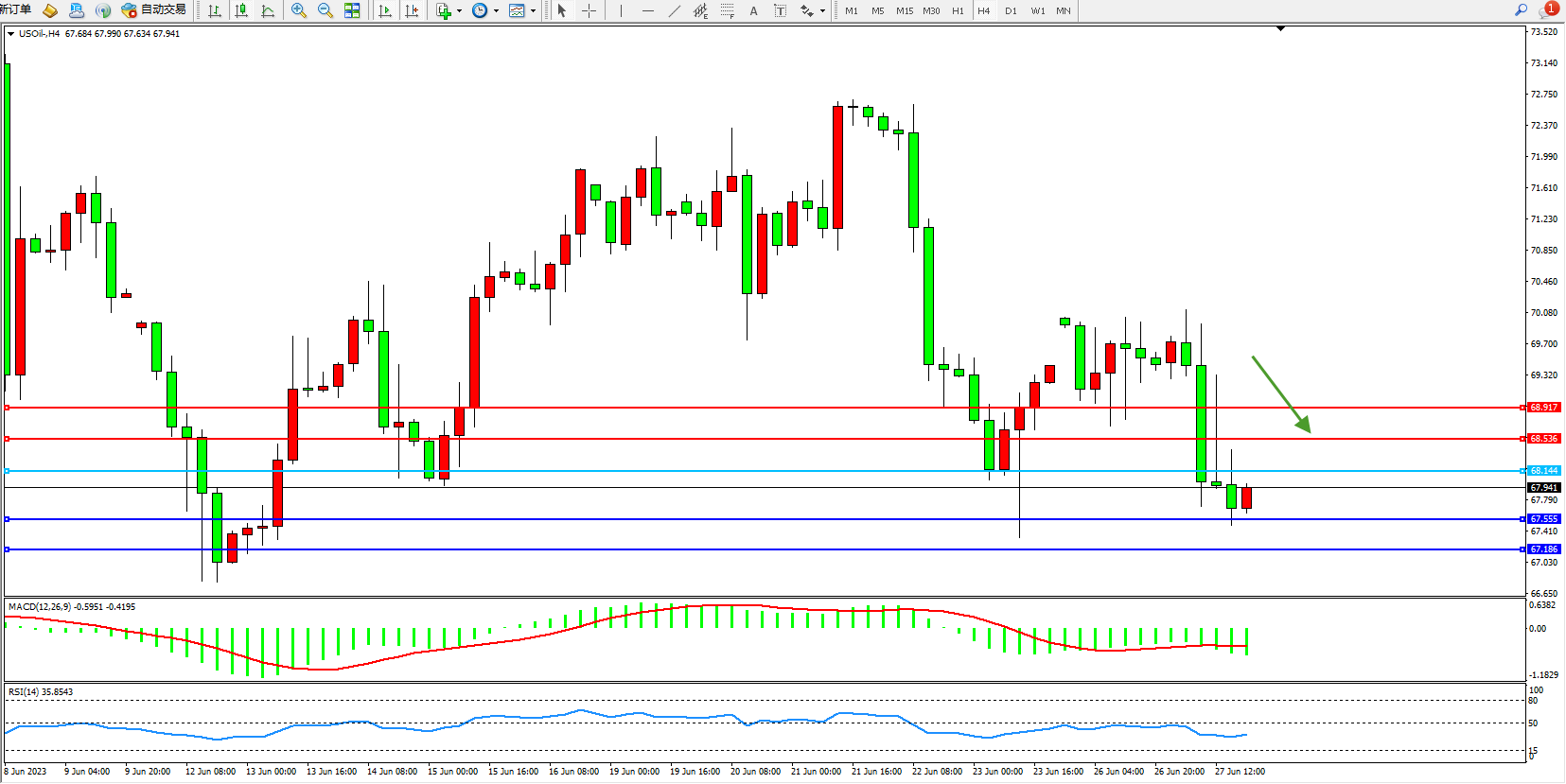 交易策略:68.144下方看跌,目标67.555 67.186