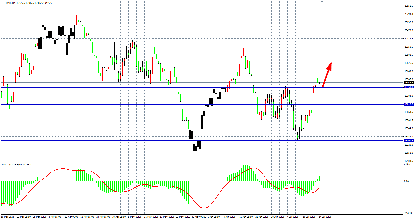 4小时图看,恒指在19350上方稳固,MACD量能上穿零轴,多头表现仍旧较强,目前支撑上移19350附近,该位上继续看涨19600-20000。